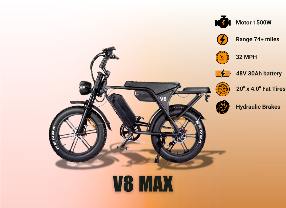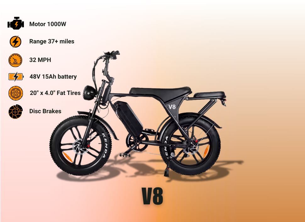 On or off the trail, the V8 Model is engineered for durability. With a reinforced frame, heavy-duty fat tires, and a waterproof battery, this bike is built to perform reliably mile after mile.