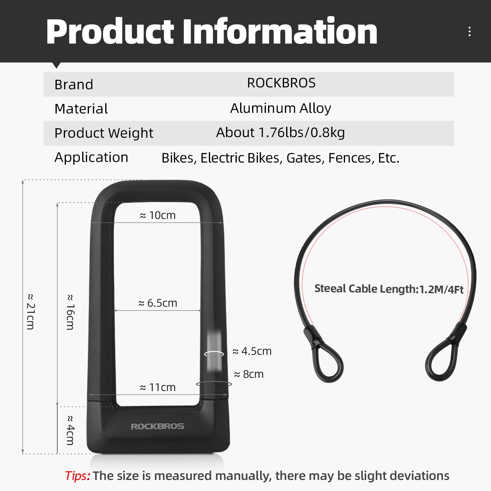 - 1.2M/4Ft Steel Cable: This bike u lock comes with a 1.2M/4Ft double looped end steel cable. If need more space, you can tie the bike to fence or post with the long steel cable. Steel cable is strong but also very flexible so you can wrap it as you need.